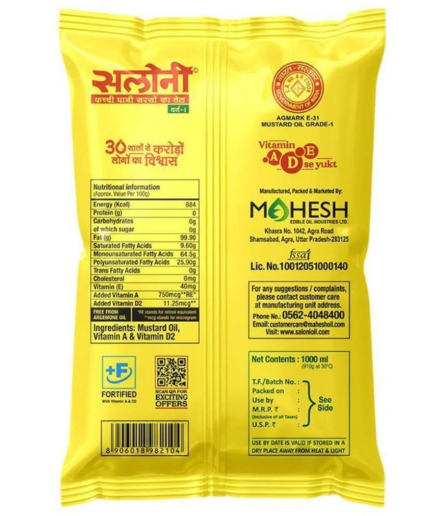 • Mustard oil, which is produced from the seeds of the mustard plant, is a common ingredient in Indian cuisine. Known for its strong flavor, pungent aroma, and high smoke point, it's often used for sautéing and stir-frying vegetables. Relish the taste of Saloni Kachi Ghani Mustard Oil in your meals. Buy this product online now